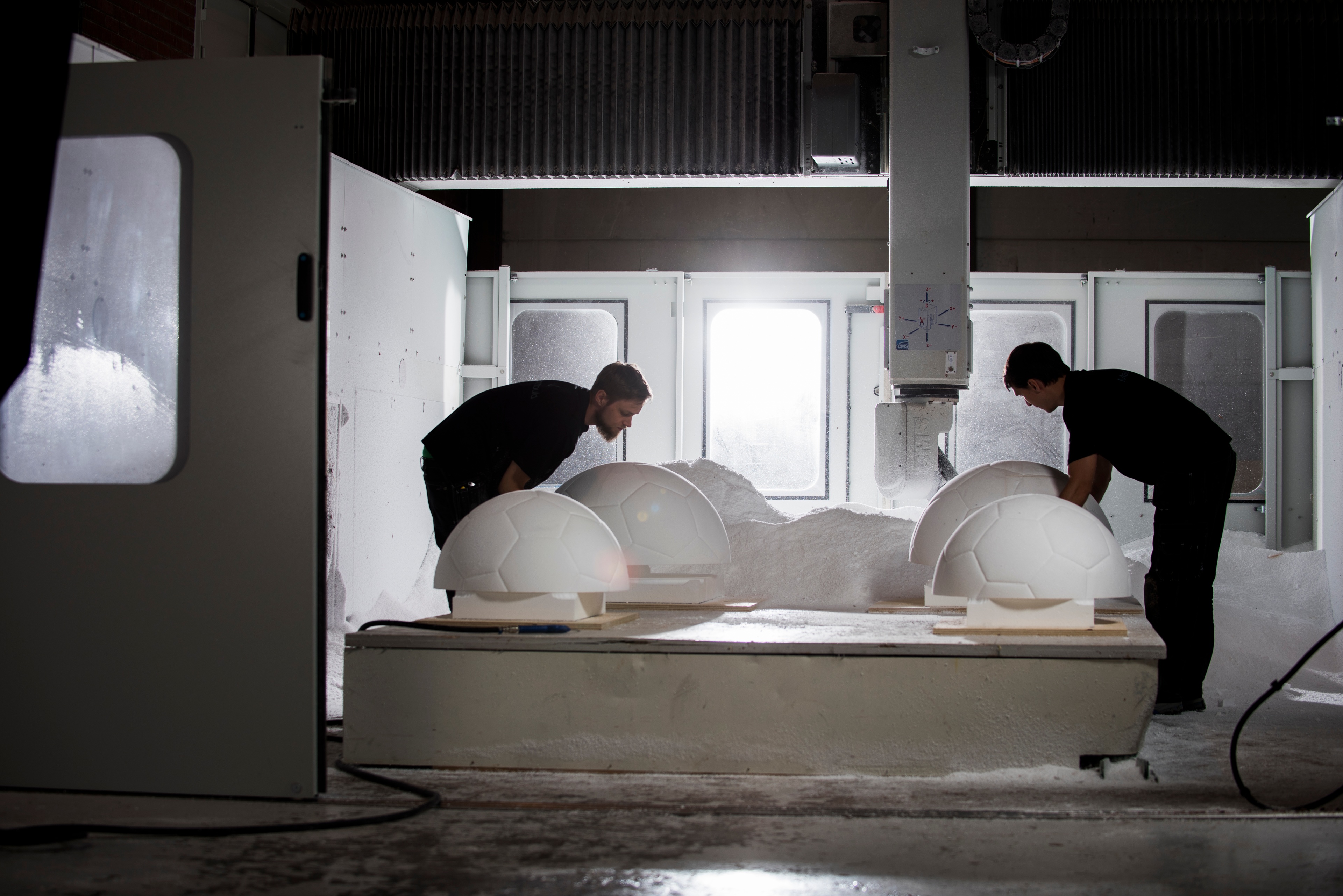 Hjärtat i vår maskinpark består av tre 5-axliga fräsar CMS Poseidon, CMS MX5 och en Bellotti VEGA. Där vår Poseidon tar modeller upp till 25 x 6,2 x 2,3 meter, vår Belotti VEGA tar modeller upp till 20 X 6,2 X 3 meter och i vår MX5 kan vi fräsa modeller upp till 5 x 3,8 x 1,4 meter.
